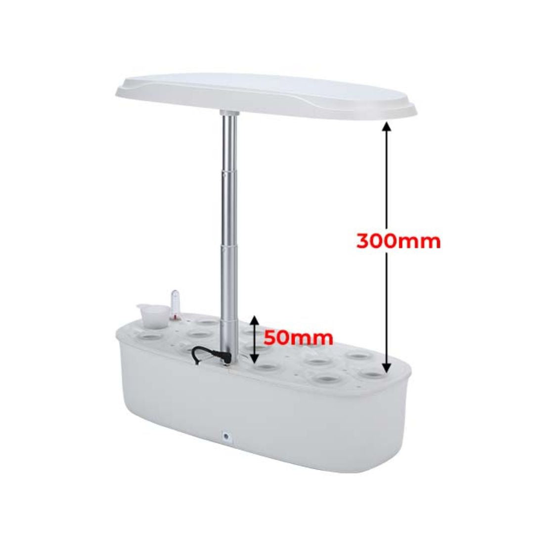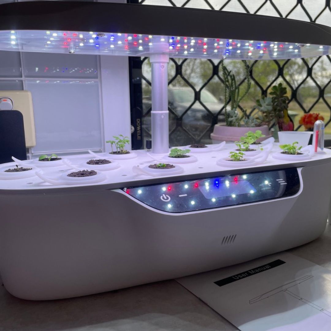 This compact hydroponic system, featuring 12 plant holes and integrated LED lighting, is designed for growing fresh herbs, vegetables, and greens right on your kitchen bench.